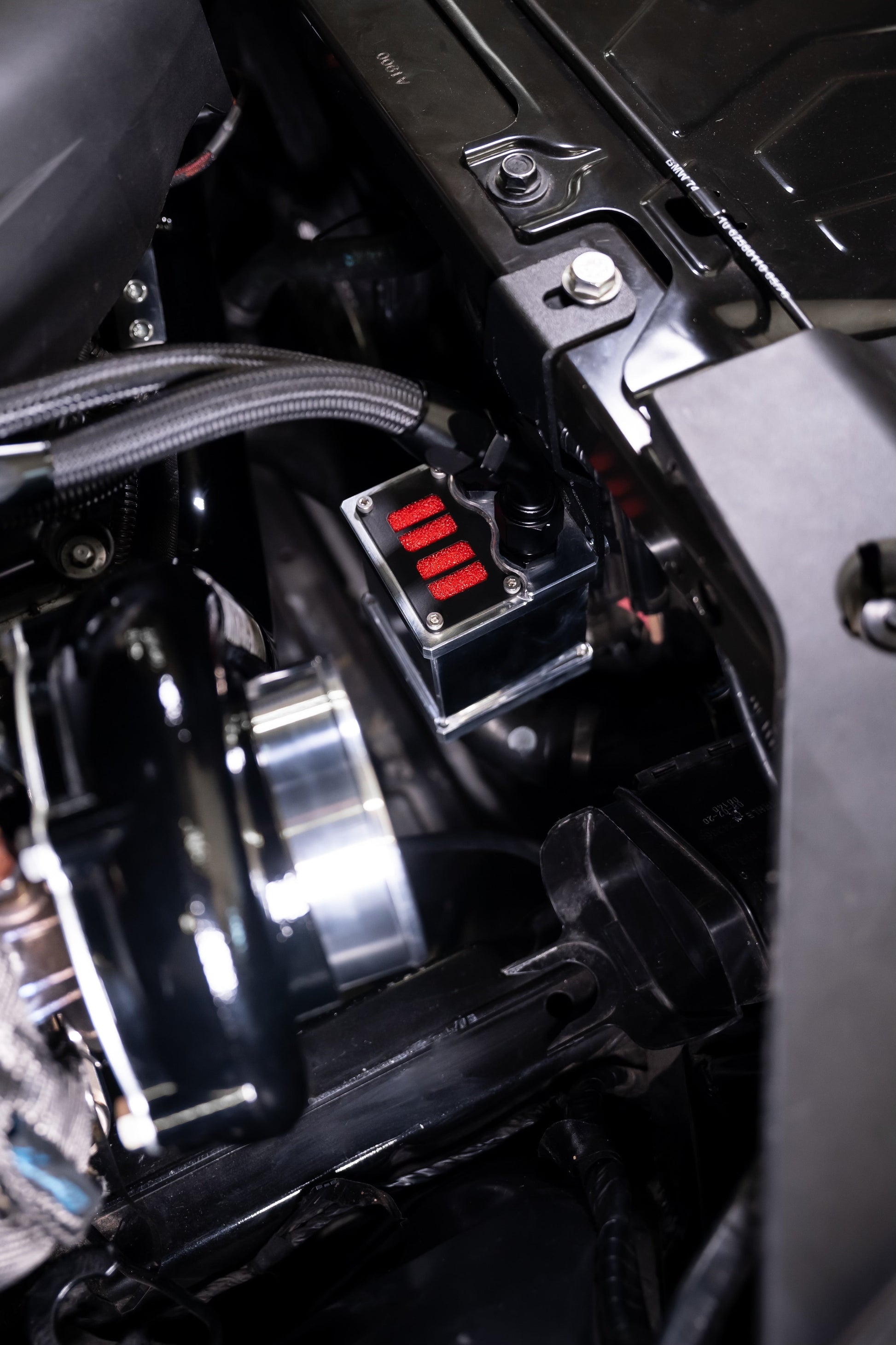 Any B58 that is tuned will eventually suffer from excessive crank case pressure. Most people choose to vent the oil cap with a filter to remedy this, which can leave a big mess and looks pretty awful. Our B58 Catch can routes a braided AN hose from our custom billet oil cap to the catch can all while staying UNDER the engine cover!
