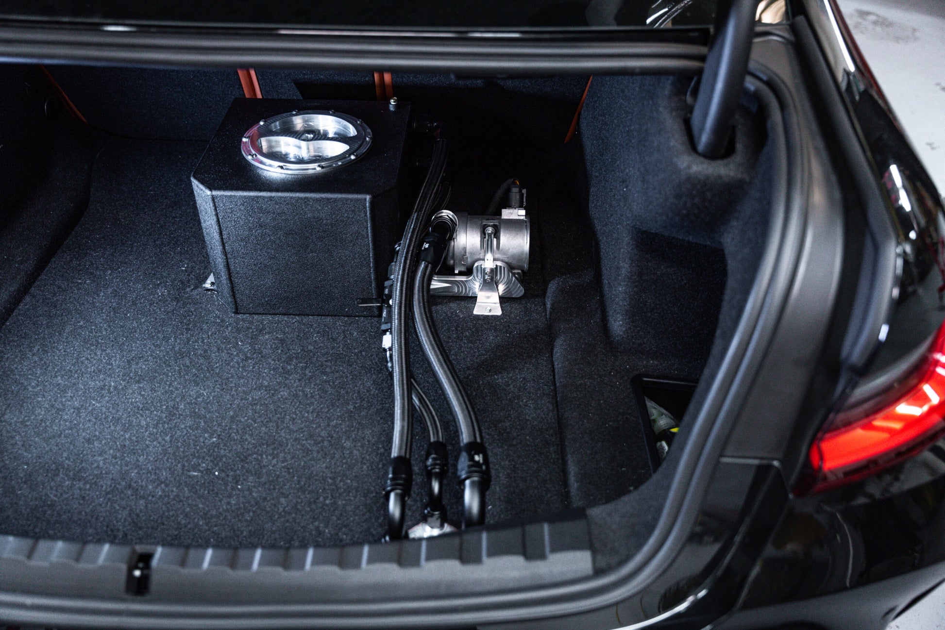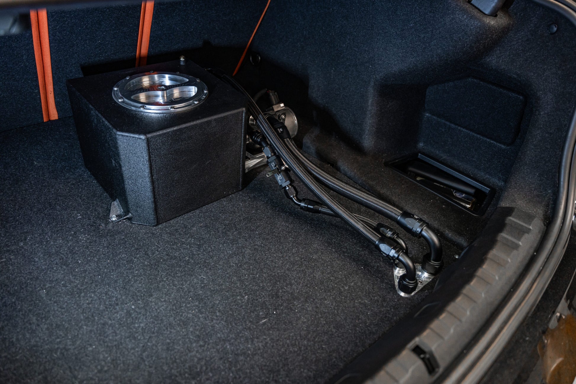 With the configuration shown in the photos it will not work with the factory exhaust due to the size of the muffler. Pass through fitting will need to be relocated to a different location for cars running factory exhaust.