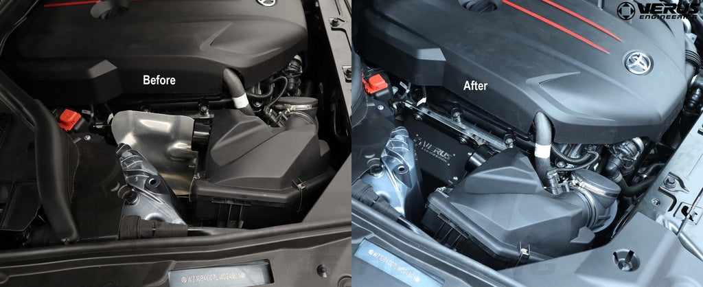 When utilizing this whole bundle, you can expect a better-looking engine bay, better thermal properties, less heat soak, and an oil free intake. To top things off, we've added the Resonator Delete to seamlessly tie everything together.